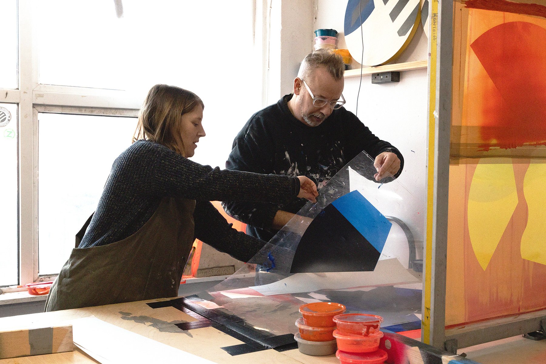 The resulting works celebrate happy accidents that the screen printing process can generate - full of texture and layering. Both Katy and Mark have talked about how the process has changed their own work for the better - whilst they also subconsciously swapped colour palettes!